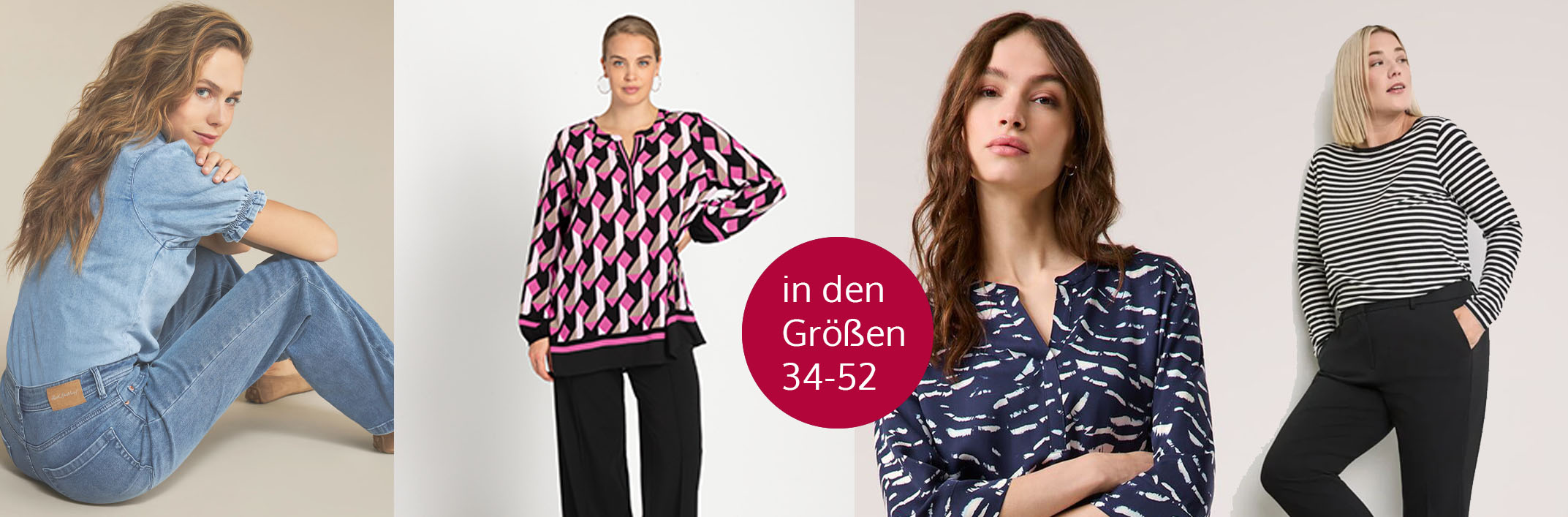 Sie finden hier trendige Outfits, schicke, feminine Freizeitkleidung und Geschäftsbekleidung bis hin zu festlicher Abendrobe in den Größen 34 bis 52 und Kurzgrößen. Die passenden Accessoires können Sie sich gleich mit aussuchen. Genießen Sie einen Bummel durch unser vielfältiges Angebot. Ob mit oder ohne Beratung – ganz wie Sie es wünschen.